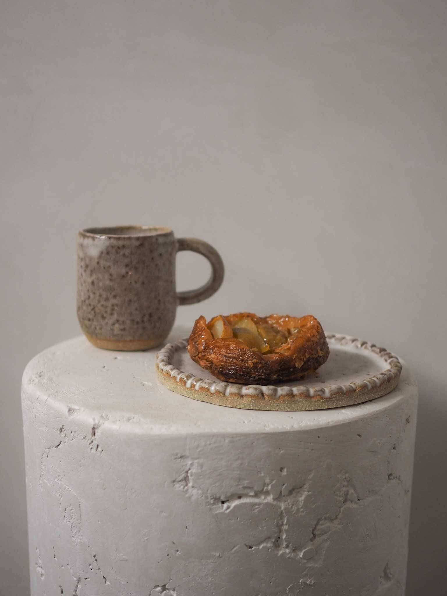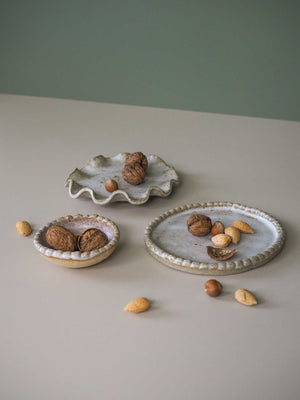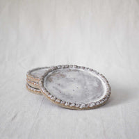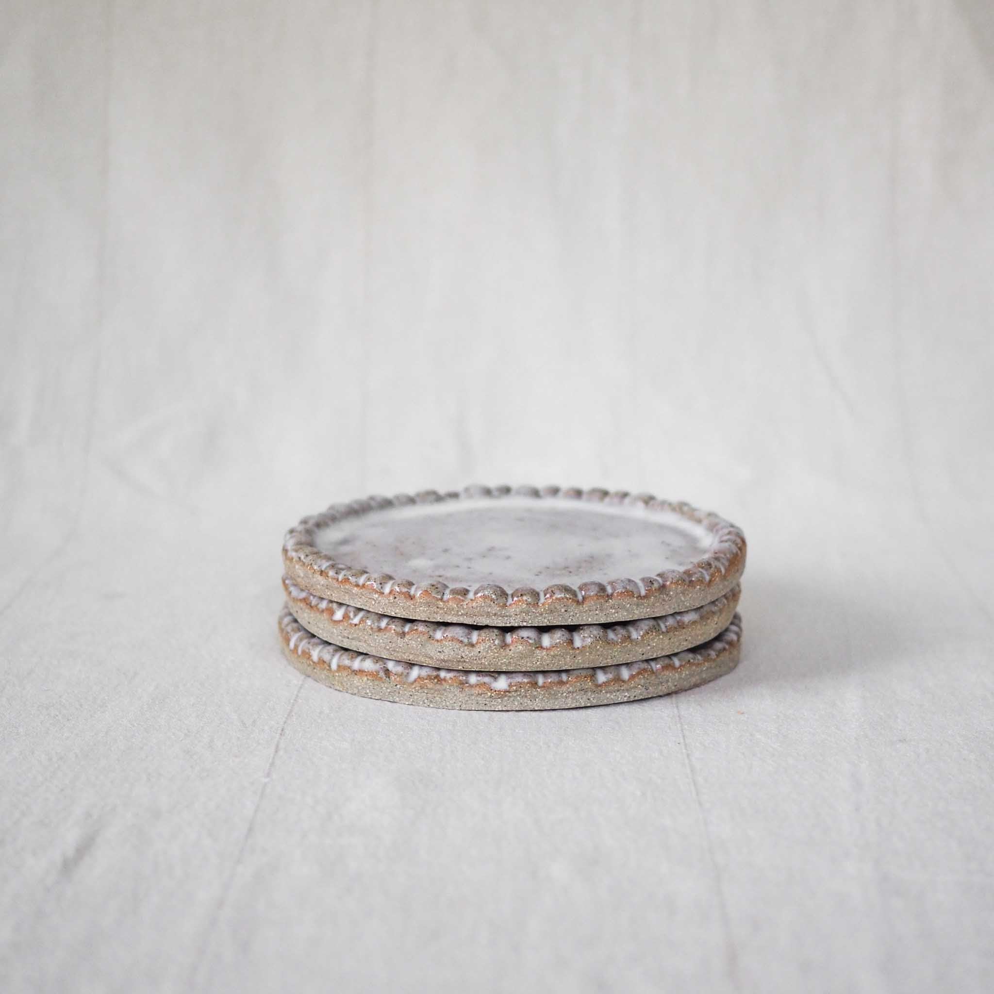 Detailing small ceramic pearls around the rim of the plate. Perfect as a side plate for a pastry, slice of cake, or perhaps to display your beautiful jewels. or a candle on. Glazed in a soft satin white. No two pieces will ever be exactly the same… But that’s the beauty of them.