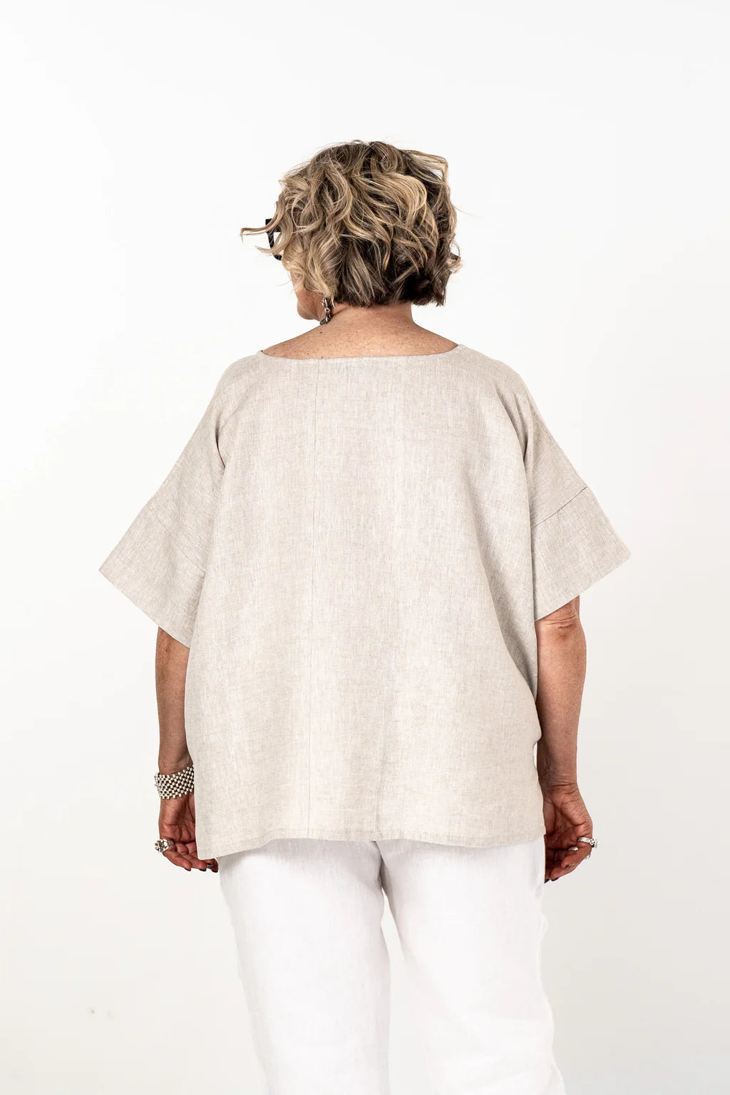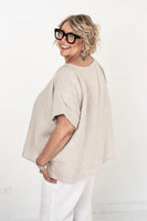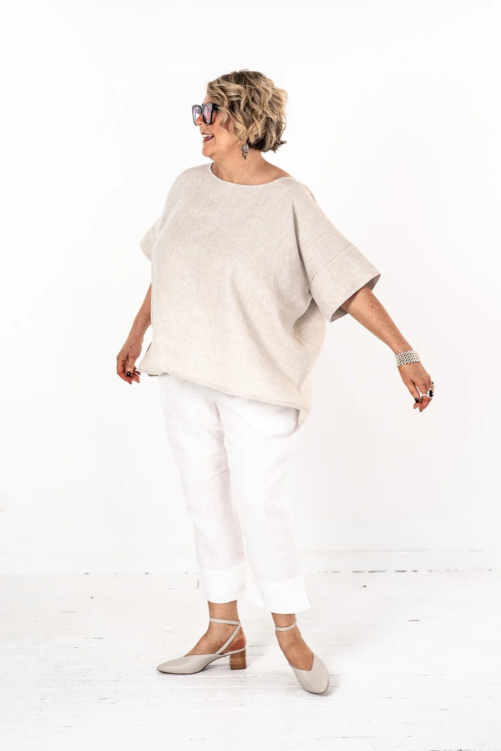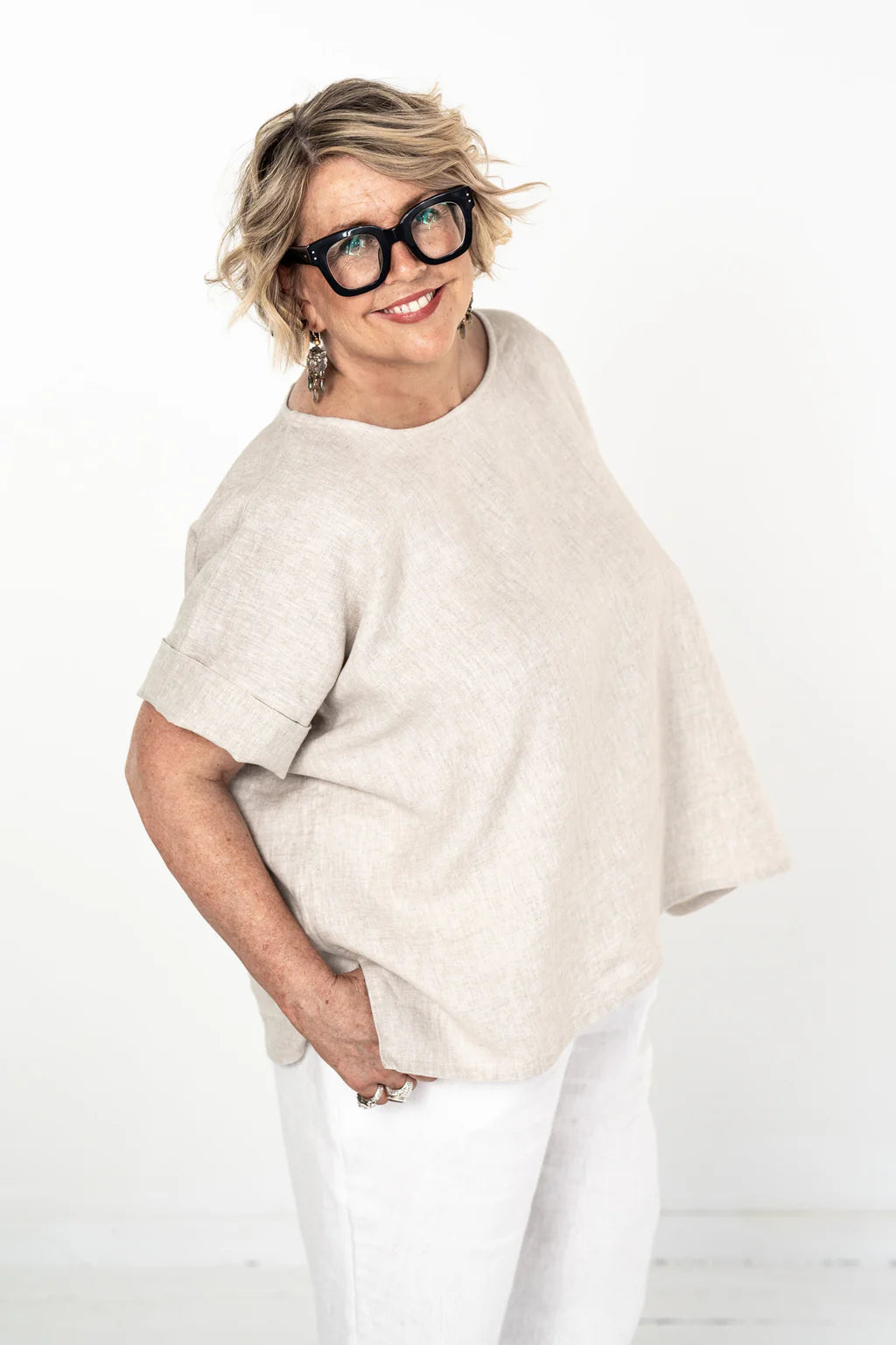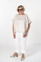 The Eva's Sunday Riley Top is our version of the perfect oversized t-shirt. The style fits loose and boxy with small splits at the side seam. The neckline is rounded and slightly boat-shaped. The sleeve falls around elbow length; wear it down or cuffed back. It’s a simple shape, but very elegant and most certainly what we consider to be an essential ES garment.
