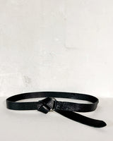 This handcrafted soft leather, the Salice Belt is a narrowish style, with a bronze ring to thread the belt through.