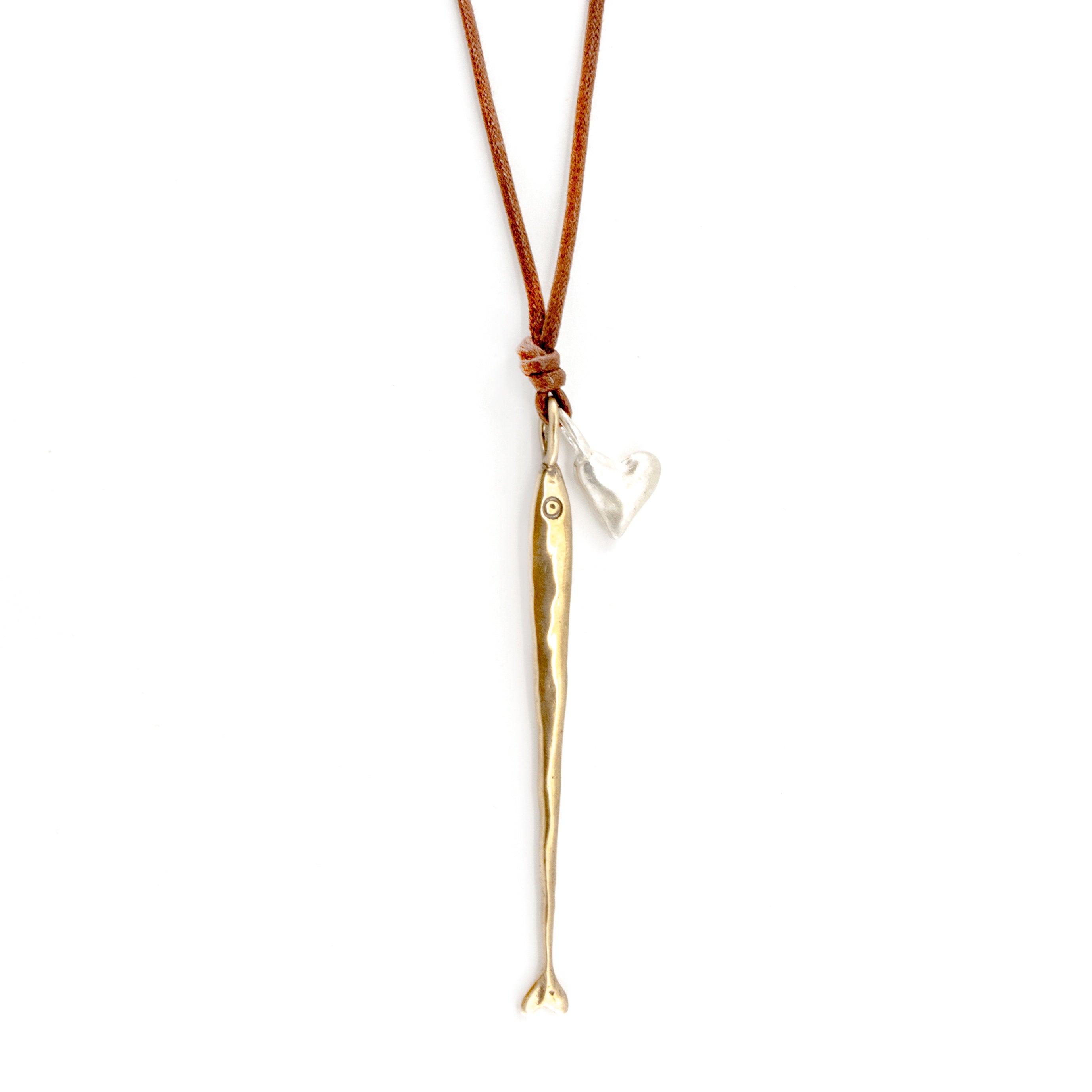 The Sardina pendant is made from handcast bronze on a waxed cotton cordand features a cast solid silver heart.