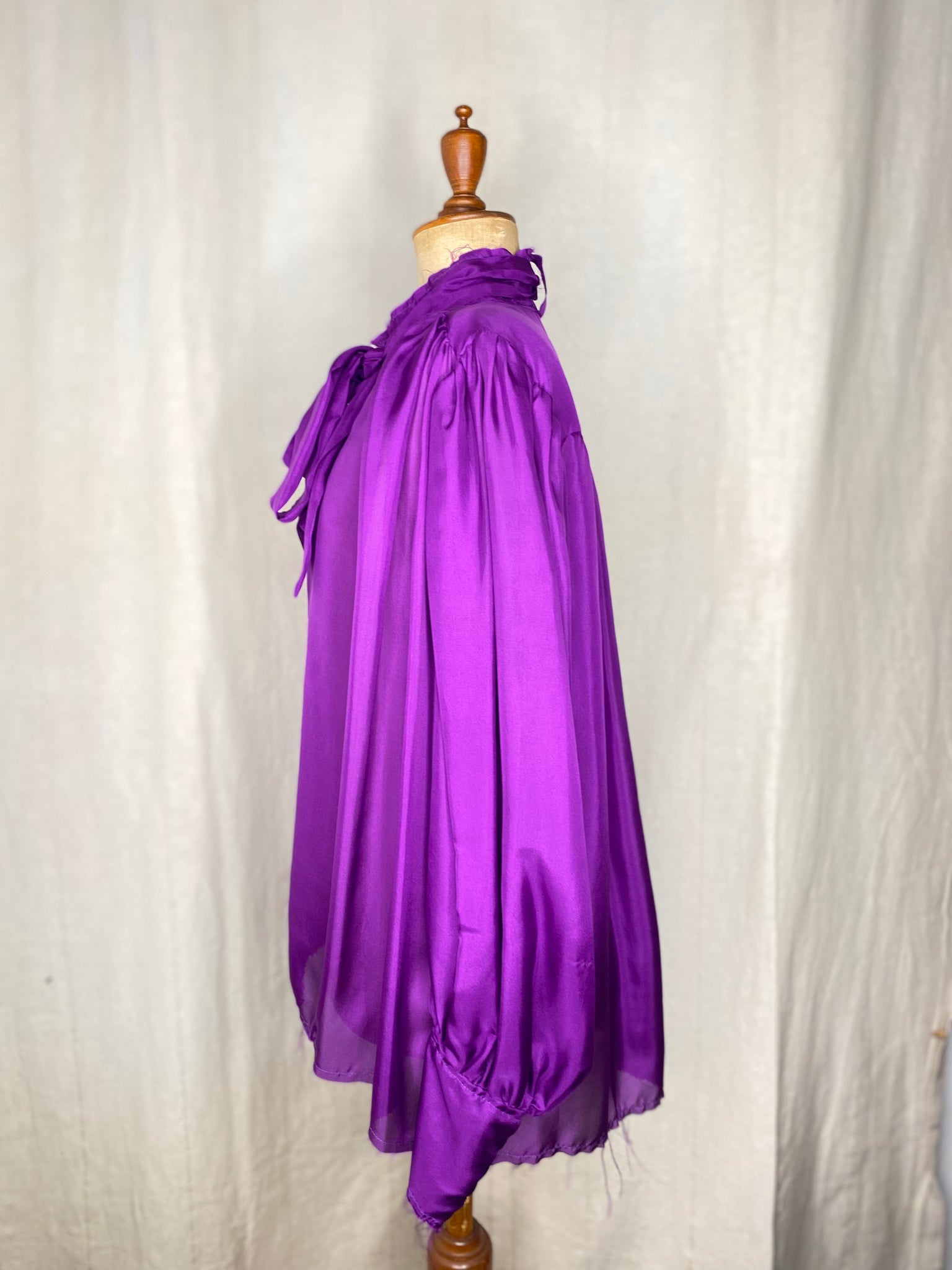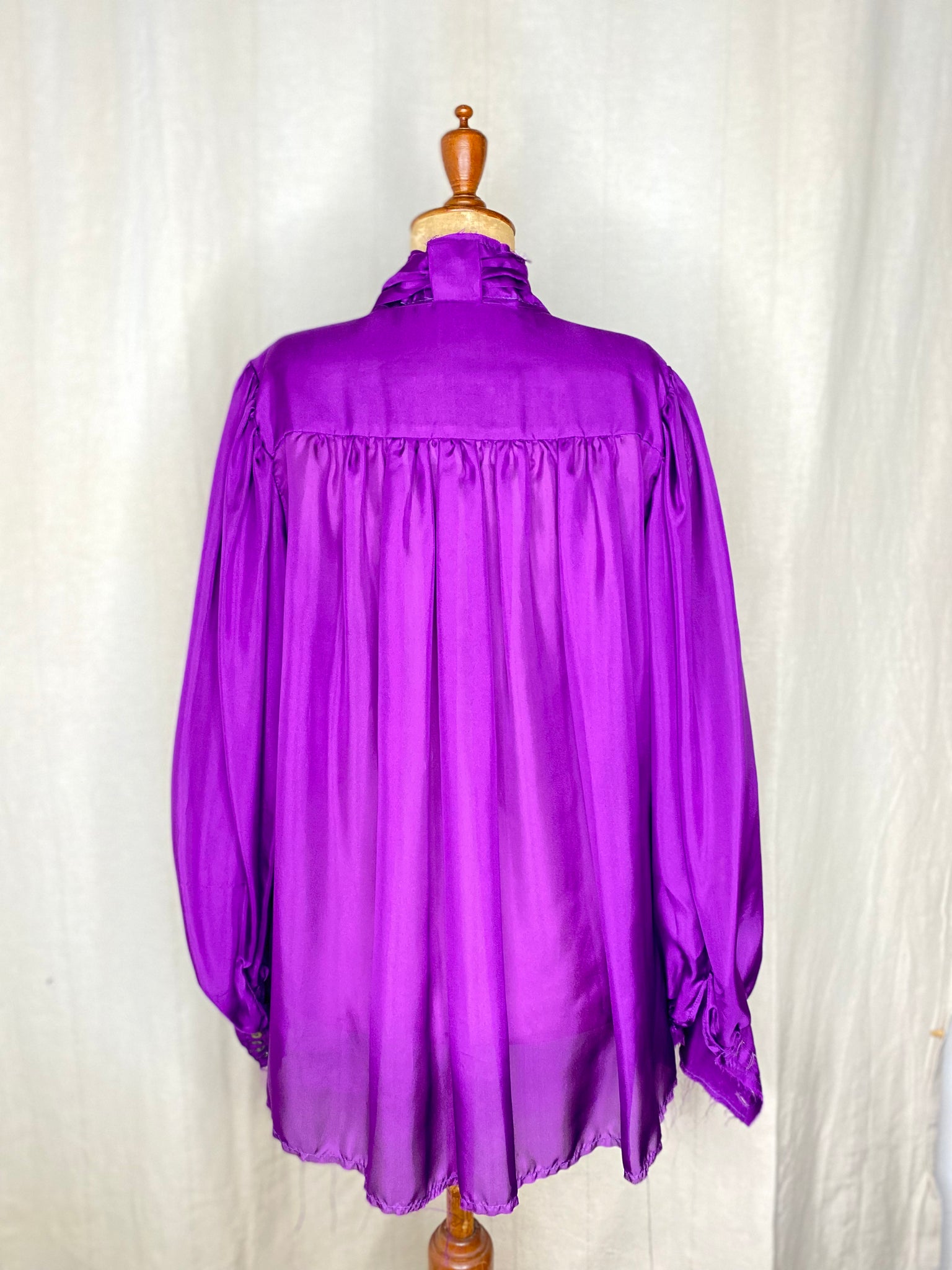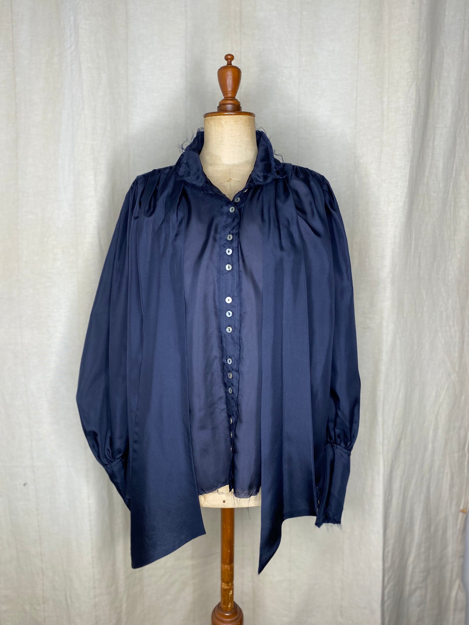 this blouse has a mutton sleeve with cuffs and river shell buttons. this blouse can be worn full sleeve length or as an elbow 3/4 sleeve for the warmer months.