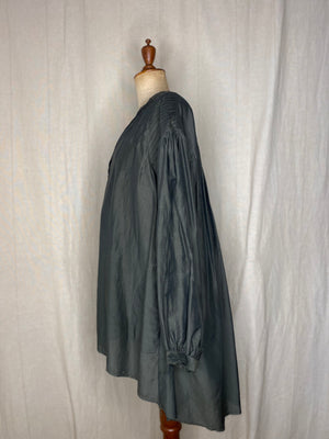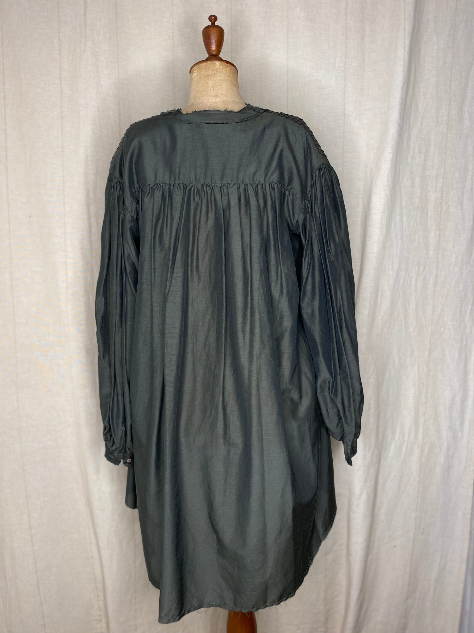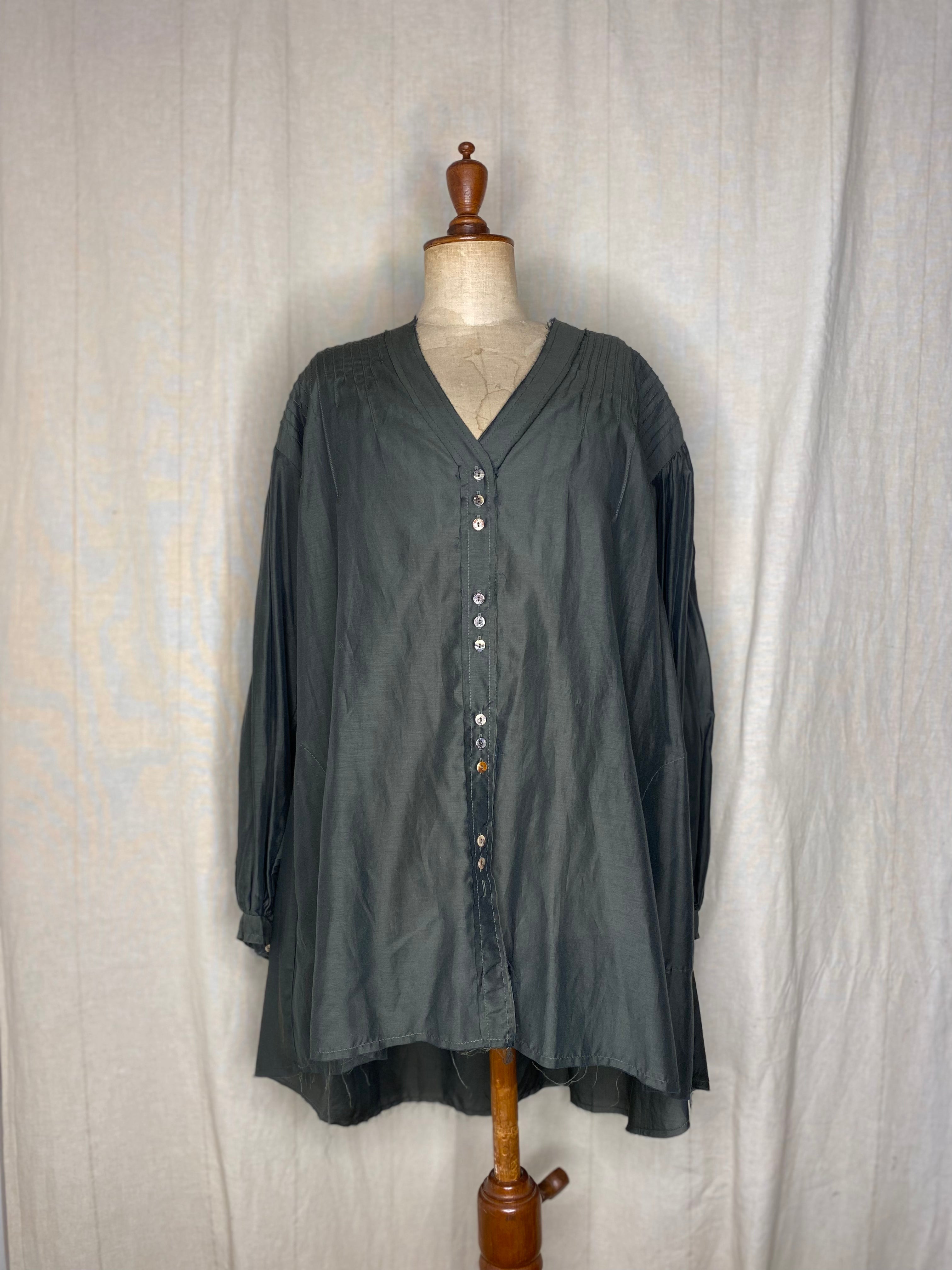 This pieces is a relaxed fit with a high low hemline, raw edge trims and functional pockets and French seams through out,