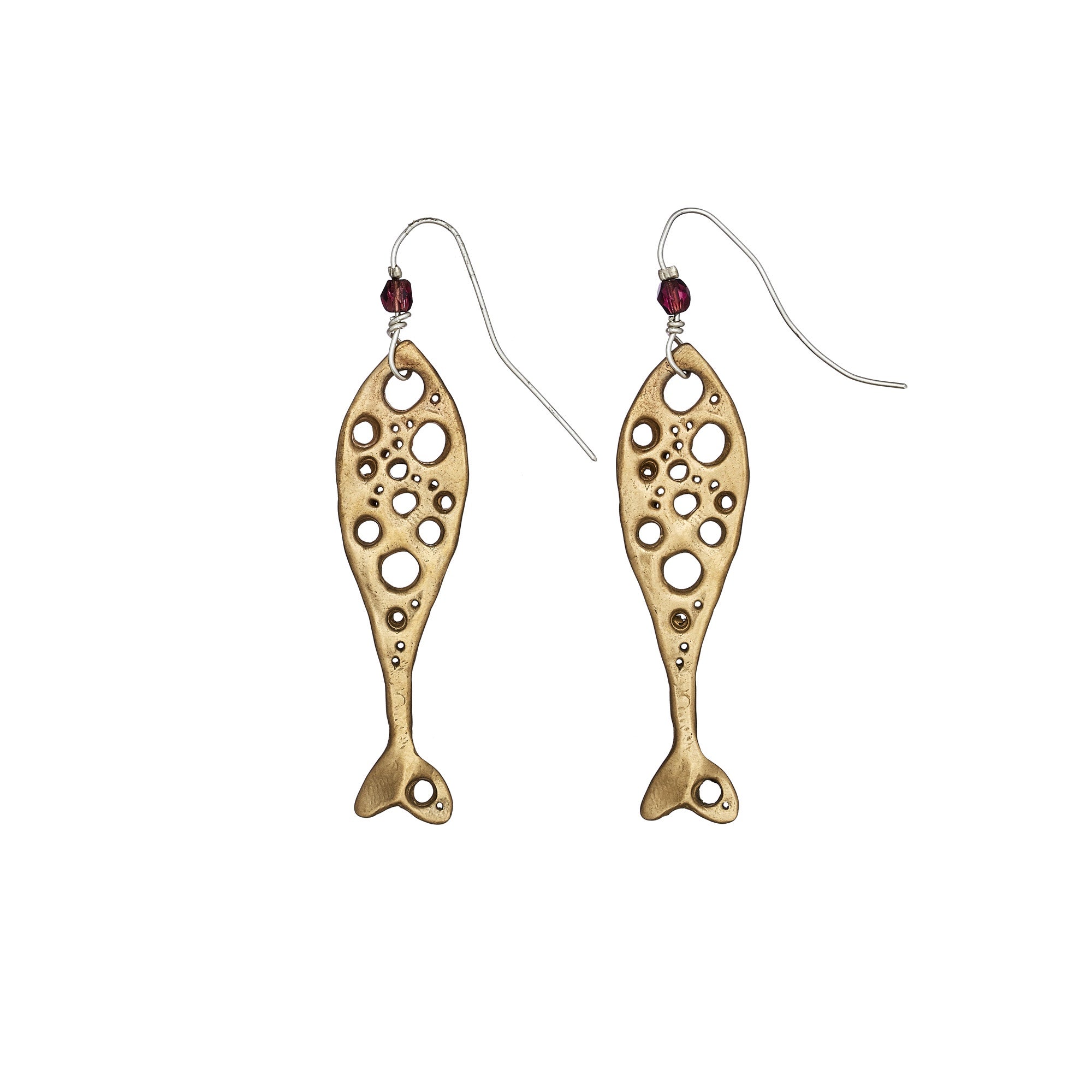 The Sogliole - Sole Fish Earrings are made from handcast bronze, with a tiny glass bead and surgical steel threads.