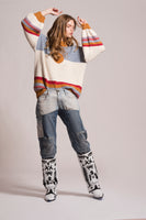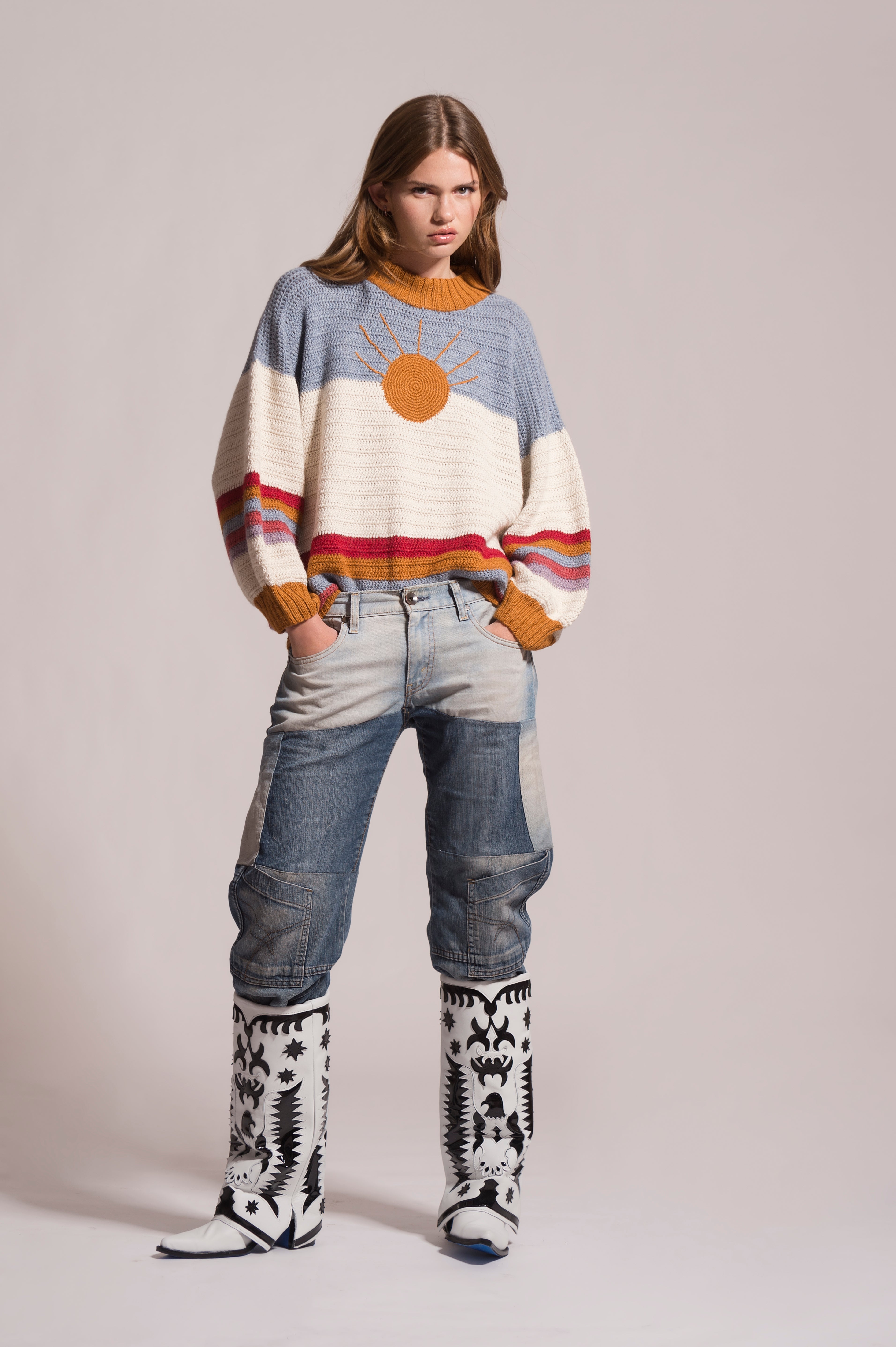Featuring a stunning sunset design, it has an oversized fit with long sleeves and short 'turtle' neckline.