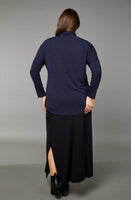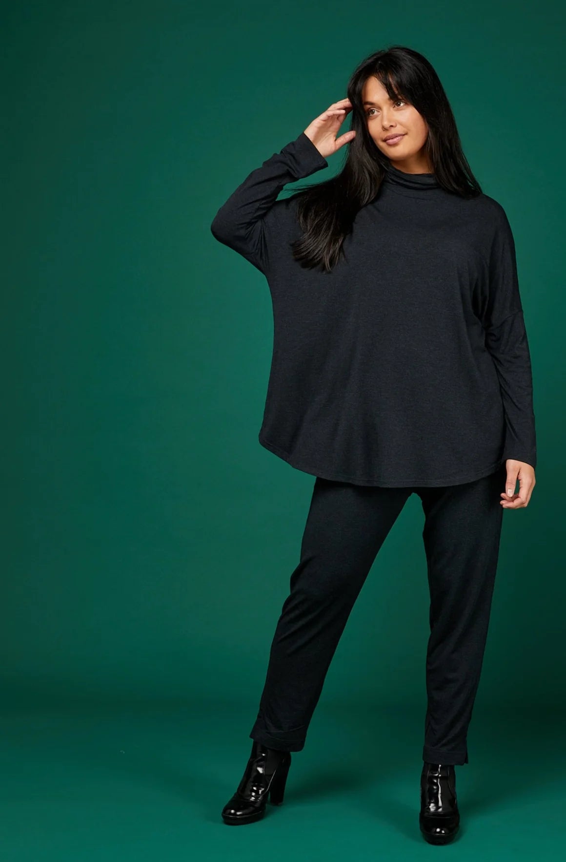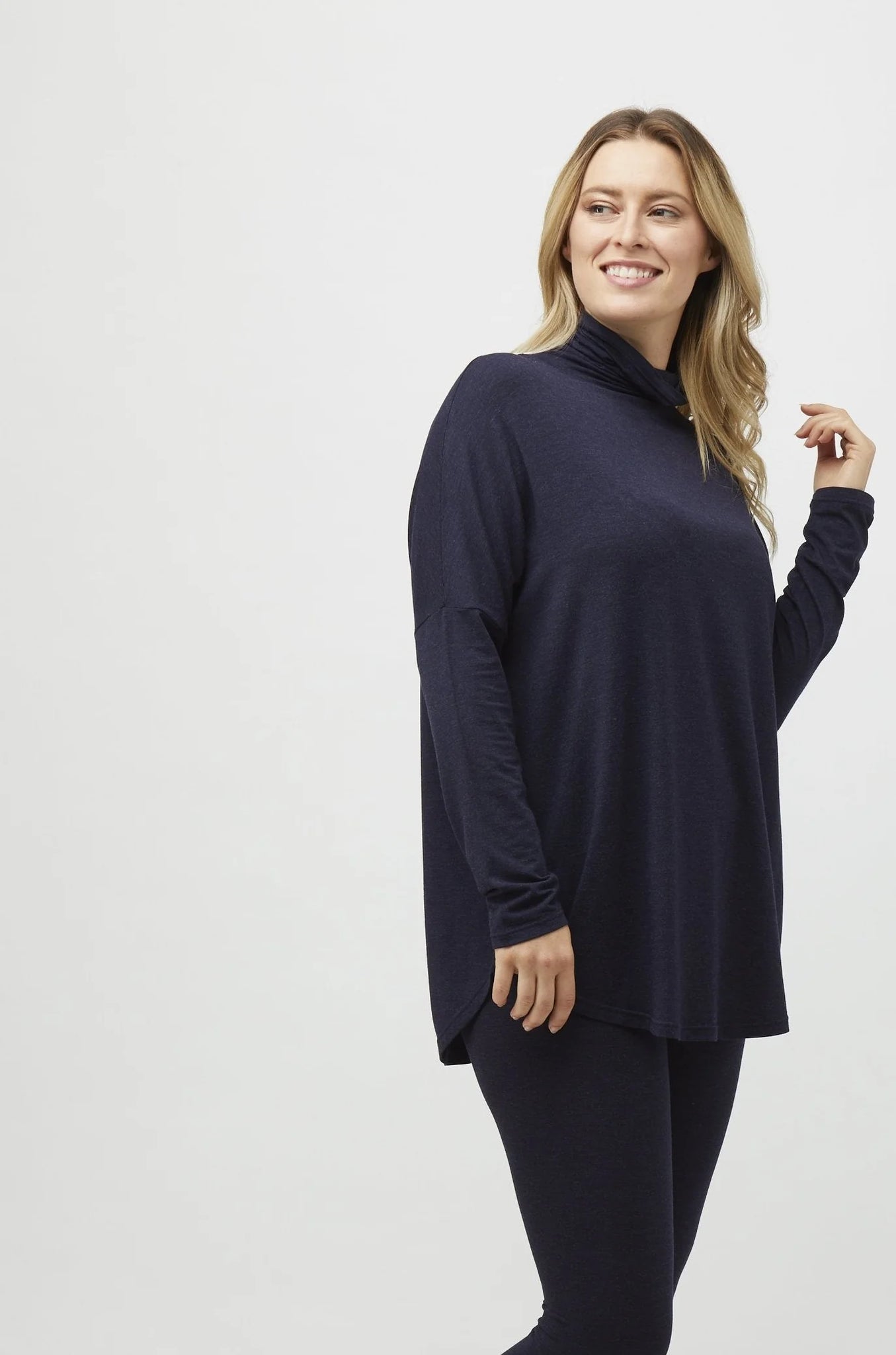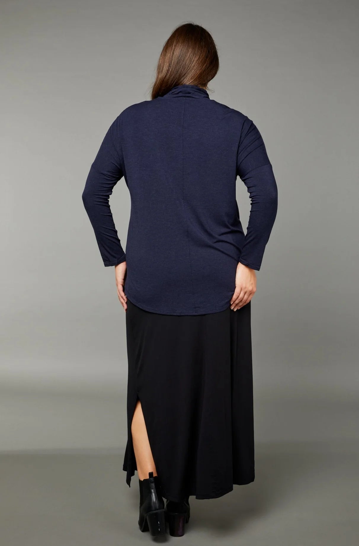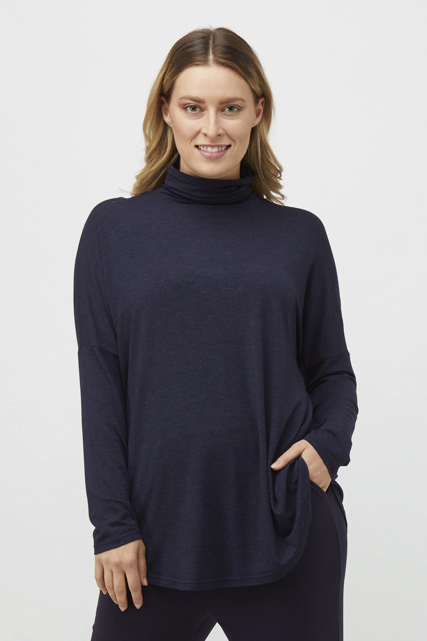 With extra room around the bust through to hemline, this top features a full length sleeve, folded soft roll turtleneck & curved back hem.
