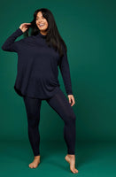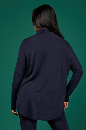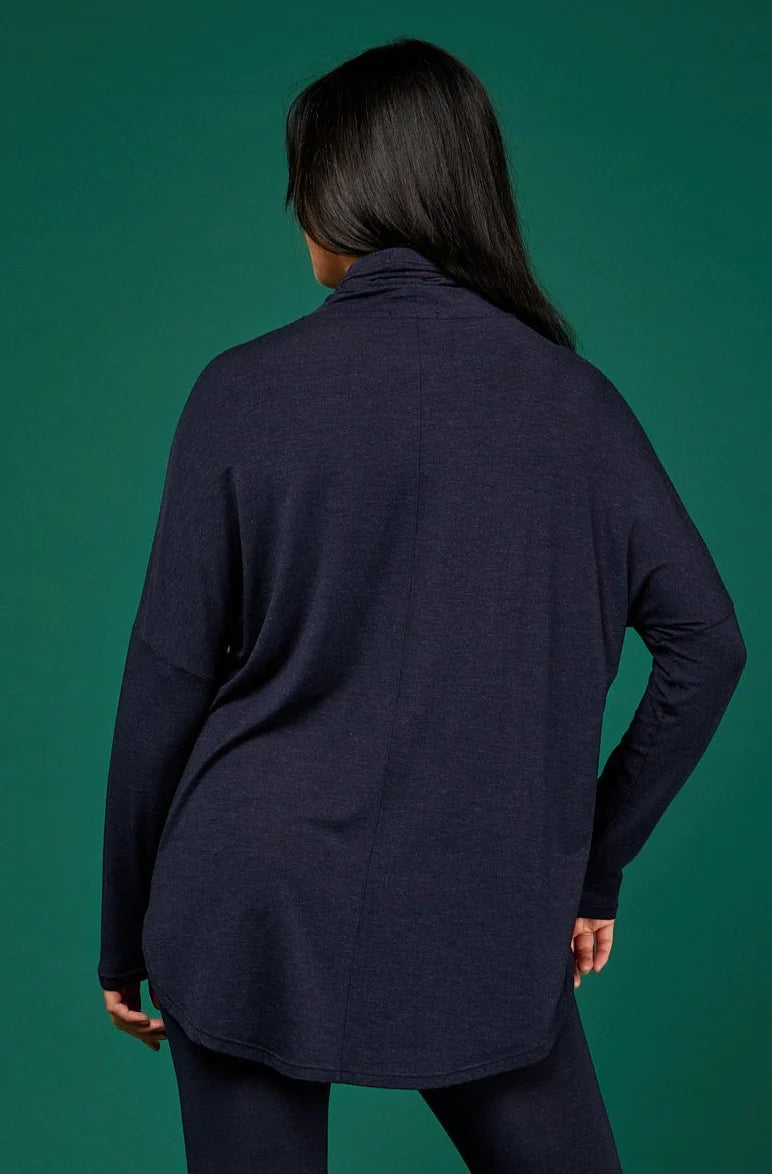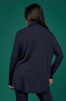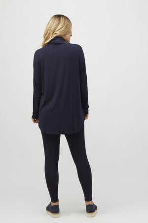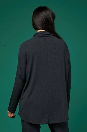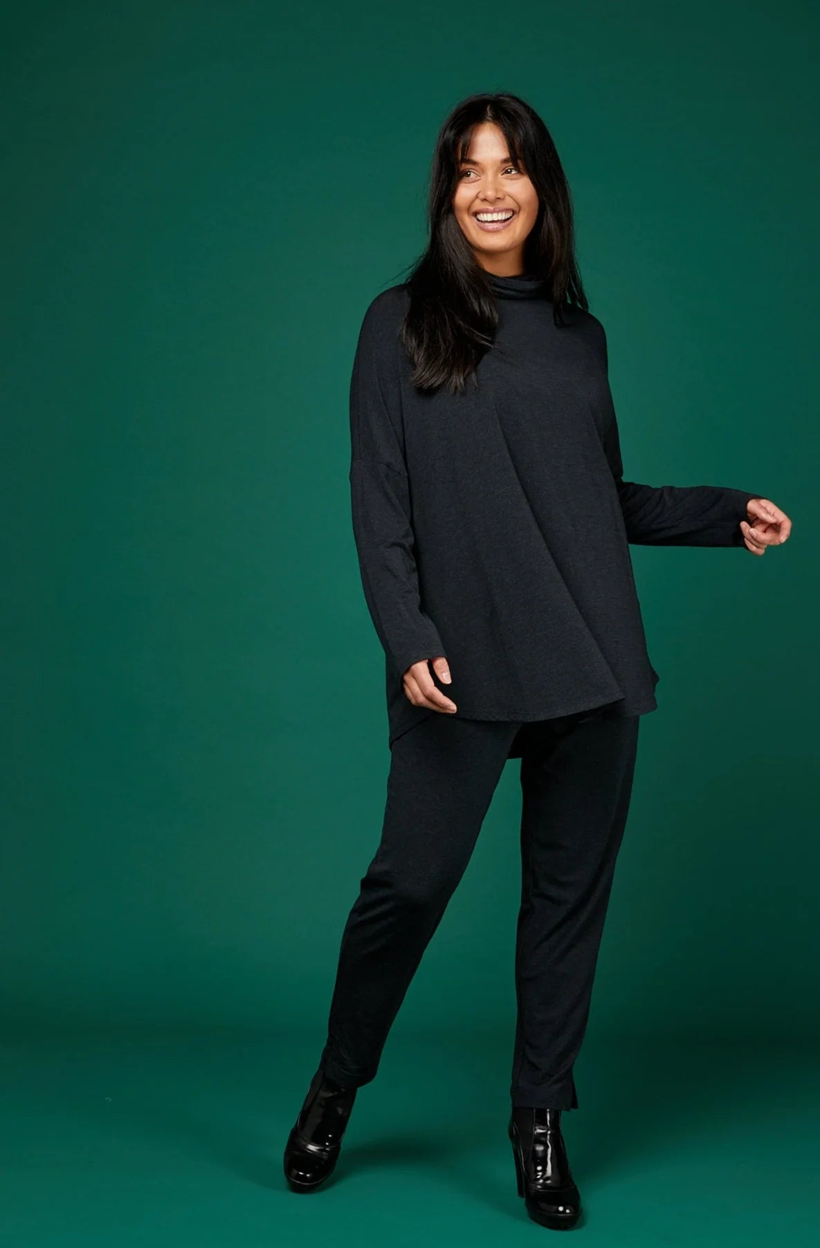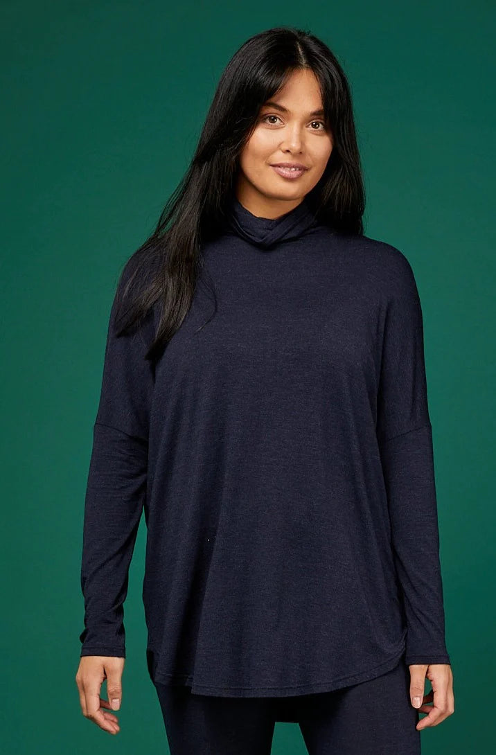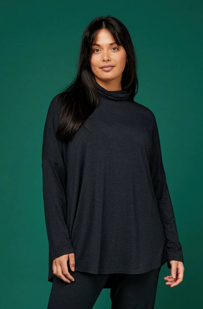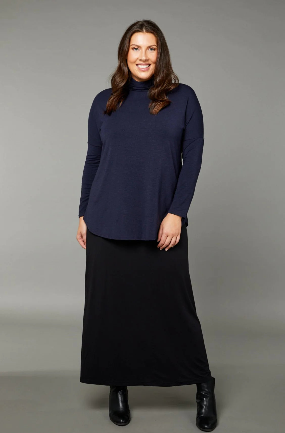With extra room around the bust through to hemline, this top features a full length sleeve, folded soft roll turtleneck & curved back hem.