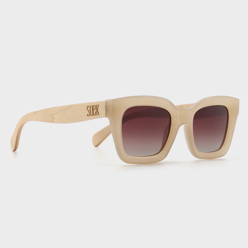 These popular 90s inspired sunglasses are a mid-sized style that will suit most face shapes and sizes. The Zahra sunglasses are finished in a flattering cream tone and fitted with white maple wood arms.